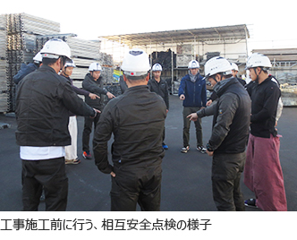 組みあがった仮設足場の細部にわたるまで漏れの無い正しい点検を行い、足場の上で作業する人が安心して作業に集中できる様に、事故の無い作業現場の構築を支えています。